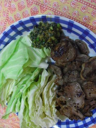 生キャベツとニラみそ。 フライパンで焼き、焼き色がついたら