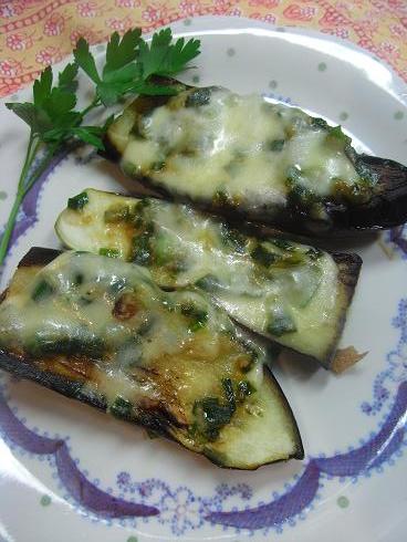 なすのみそチーズ焼き塩こしょうで焼いた豚タンに 半分に切ったナスを切り口を下にして