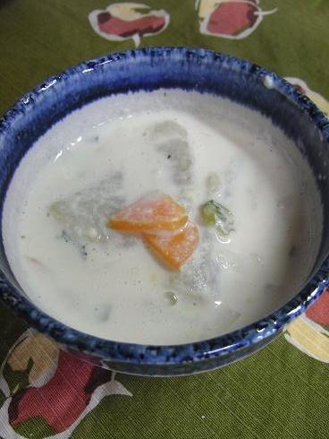 ホワイトソースパスタコンソメの豆乳のスープを 次の日はスープにアスパラとピザ用